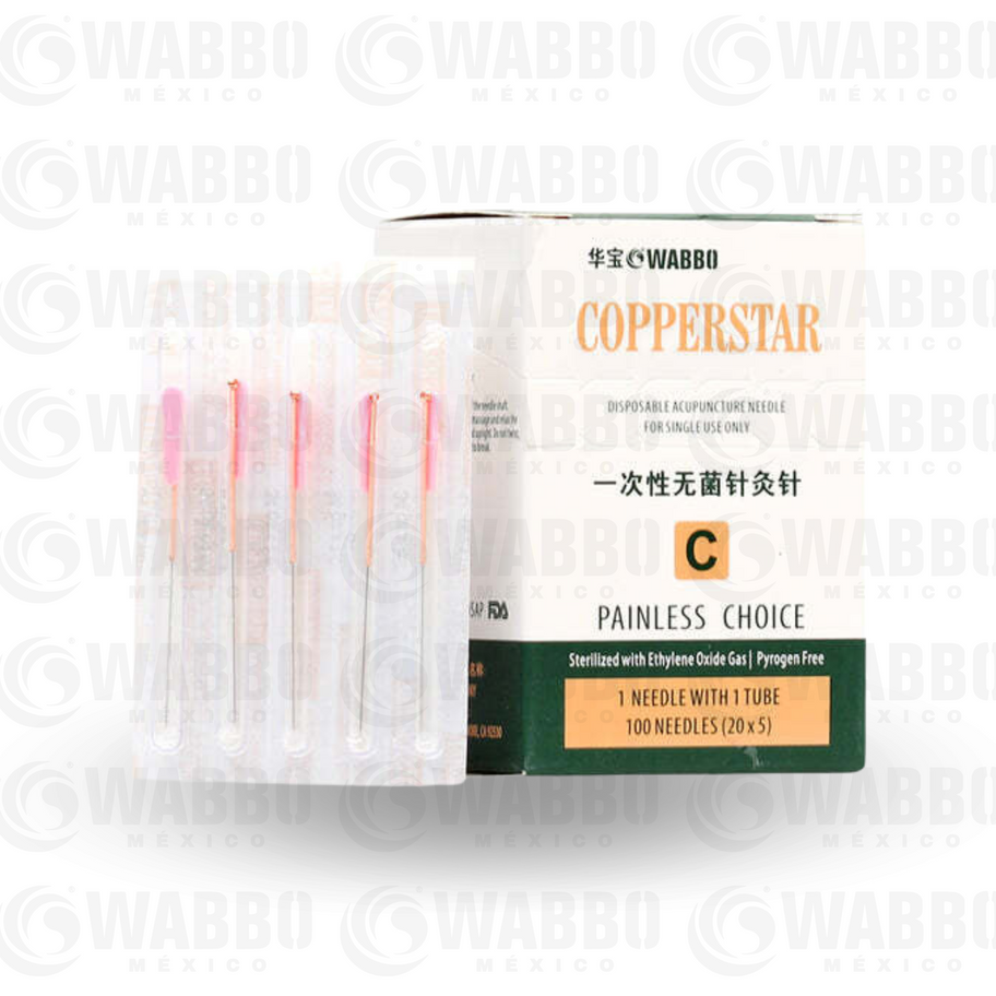 La Aguja Copper Star, con mango de cobre, cada aguja viene envasada individualmente en un tubo guía, con una lengüeta codificada por color para asegurar su correcta sujeción y facilitar su uso.